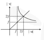 to get a clear image of the object. A graph between the object distance $u$ and the image distance $v$, from the lens, is plotted using the same scale