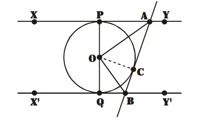 In fig., $\mathrm{XY}$ and $\mathrm{X}^{\prime} \mathrm{Y}^{\prime}$ are two parallel tangents to a circle with centre $\mathrm{O}$ and another tangent $\mathrm{AB}$ with point of contact $\mathrm{C}$ intersecting $\mathrm{XY}$ at $\mathrm{A}$ and $\mathrm{X}^{\prime} \mathrm{Y}^{\prime}$ at $\mathrm{B}$. Prove that $\angle \mathrm{AOB}=90^{\circ}$