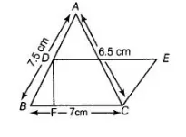 In figure, ΔABC has sides AB = 7.5 cm, AC = 6.5 cm and BC = 7 cm. On base BC a parallelogram DBCE of same area as that of ΔABC is constructed.
