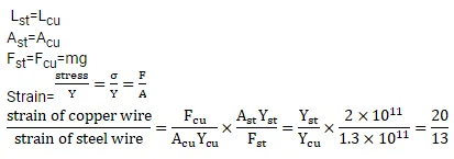 In figure the upper wire is made of steel and the lower of copper. The wires have equal cross-section. Find the ratio of the longitudinal strains developed in the two wires.