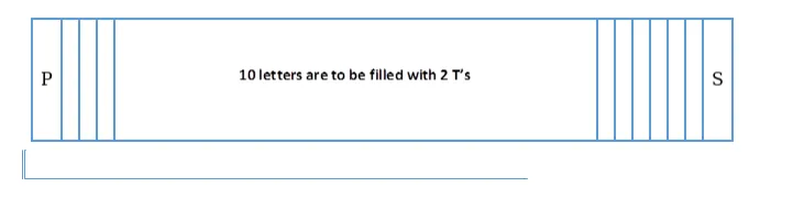 As two positions are occupied the remaining 10 positions are to be filled with 10 letters in which we have $2 \mathrm{~T}^{\prime} \mathrm{s}$.