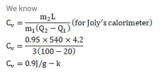 In Joly's differential steam calorimeter, $3 \mathrm{~g}$ of an ideal gas is contained in a rigid closed sphere at $20^{\circ} \mathrm{c}$. The sphere is heated by steam at $100^{\circ} \mathrm{C}$ and it is found that an extra $0.095 \mathrm{~g}$ steam has condensed into water as the temperature of the gas becomes constant. Calculate the specific heat capacity of the gas in $\mathrm{J} / \mathrm{g}-\mathrm{K}$. The latent heat of vaporization of water $=540 \mathrm{cal} / \mathrm{g}$.