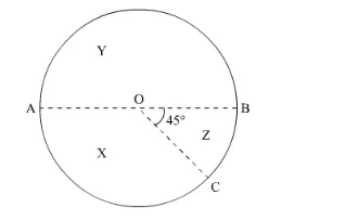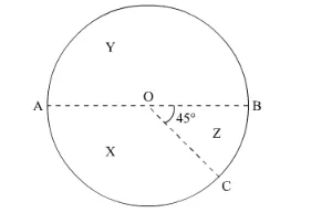 In the accompanying diagram a fair spinner is placed at the centre O of the circle Diameter AOB and radius OC divide the circle into three regions labelled X, Y and Z. It ∠BOC = 45°. What is the probability that the spinner will land in the region X? (in the given figure).