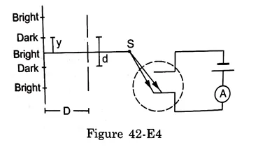 In the arrangement shown in the figure, $y=1.0 \mathrm{~mm}, d=0.24 \mathrm{~mm}$ and $D=1.2 \mathrm{~m}$. The work function of the material of the emitter is $2.2 \mathrm{eV}$. Find the stopping potential $V$ needed to stop the photocurrent.