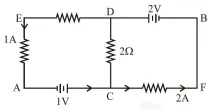 In the circuit, given in the figure currents in different branches and value of one resistor are shown. Then potential at point $\mathrm{B}$ with respect to the point $\mathrm{A}$ is :