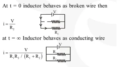 $\frac{\mathrm{V}}{\mathrm{R}_{2}}$ at $\mathrm{t}=0$ and $\frac{\mathrm{V}\left(\mathrm{R}_{1}+\mathrm{R}_{2}\right)}{\mathrm{R}_{1} \mathrm{R}_{2}}$ at $\mathrm{t}=\infty$