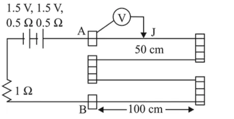$r=0.01 \Omega / \mathrm{cm}$. If an ideal voltmeter is connected as shown with jockey $\mathrm{J}$ at $50 \mathrm{~cm}$ from end $\mathrm{A}$, the expected reading of the voltmeter will be :