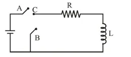 In the circuit shown here, the point ' $\mathrm{C}$ ' is kept connected to point ' $\mathrm{A}$ ' till the current flowing through the circuit becomes constant. Afterward, suddenly, point ' $C$ ' is disconnected from point ' $A$ ' and connected to point ' $B$ ' at time $t=0$. Ratio of the voltage across resistance and the inductor at $\mathrm{t}=\mathrm{L} /$ R will be equal to: