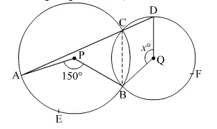 If ∠APB = 150° and ∠BQD = x°, find the value of x.
