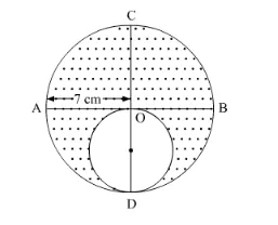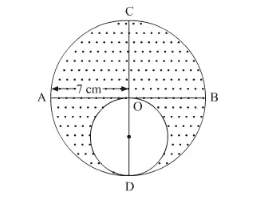 In the following figure, AB and CD are two diameters of a circle perpendicular to each other and OD is the diameter of the smaller circle. If OA = 7 cm, find the area of the shaded region.