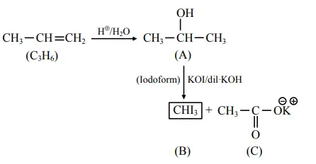 $\mathrm{C}_{3} \mathrm{H}_{6} \stackrel{\mathrm{H}^{+} / \mathrm{H}_{2} \mathrm{O}}{\longrightarrow} \mathbf{A} \stackrel{\mathrm{KIO}}{\text { dil KOH }} \longrightarrow \mathbf{B}+\mathbf{C}$
