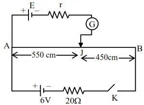 In the given figure, there is a circuit of potentiometer of length $\mathrm{AB}=10 \mathrm{~m}$. The resistance per unit length is $0.1 \Omega$ per $\mathrm{cm}$. Across $\mathrm{AB}$, a battery of emf $E$ and internal resistance ' $r$ ' is connected. The maximum value of emf measured by this potentiometer is :