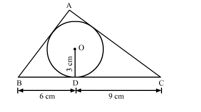 In the given figure, a triangle ABC is drawn to circumscribe a circle of radius 3 cm such that the segments BD and DC into which BC is divided by the point of contact D are, of lengths 6 cm and 9 cm respectively. If the area of △ABC = 54 cm2 then find the lengths of sides of AB and AC.
