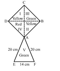 Hence, the paper required of each shade to make a kite is red paper 242 cm2, yellow paper 484 cm2 and green paper 373.04 cm2.