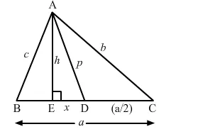 In the given figure, D is the midpoint of side BC and AE ⊥ BC. If BC = a, AC = b, AB = c, ED = x, AD = p and AE = h, prove that