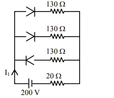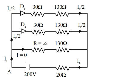 In the given figure, each diode has a forward bias resistance of $30 \Omega$ and infinite resistance in reverse bias. The current $I_{1}$ will be :