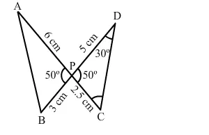 In the given figure, two lines segments AC and BD intersect each other at the point P such that PA = 6 cm, PB = 3 cm, PC = 2.5 cm, PD = 5 cm, ∠APB = 50° and ∠CDP = 30°, then ∠PBA = ?