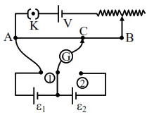 In the given potentiometer circuit arrangement, the balancing length $\mathrm{AC}$ is measured to be $250 \mathrm{~cm}$. When the galvanometer connection is shifted from point (1) to point (2) in the given diagram, the balancing length becomes $400 \mathrm{~cm}$. The ratio of the emf of two cells, $\frac{\varepsilon_{1}}{\varepsilon_{2}}$ is :