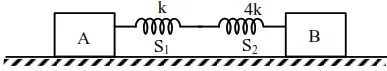 In the reported figure, two bodies $A$ and $B$ of masses $200 \mathrm{~g}$ and $800 \mathrm{~g}$ are attached with the system of springs. Springs are kept in a stretched position with some extension when the system is released. The horizontal surface is assumed to be frictionless. The angular frequency will be _____________ $\mathrm{rad} / \mathrm{s}$ when $\mathrm{k}=20 \mathrm{~N} / \mathrm{m}$.