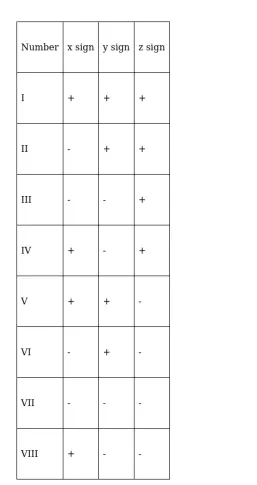 Here is a table showing signs of the x, y, z coordinates in all the octants.