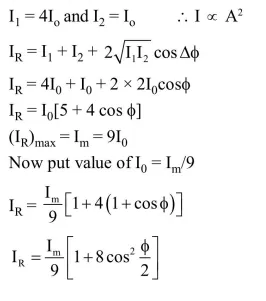 In Young's double slit experiment, one of the slit is wider than other, so that the amplitude of the light from one slit is double of that from other slit. If $\mathrm{I}_{\mathrm{m}}$ be the maximum intensity, the resultant intensity I when they interfere at phase difference $\phi$ is given by :