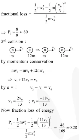 It is found that if a neutron suffers an elastic collinear collision with deuterium at rest, fractional loss of its energy is $\mathrm{p}_{d}$; while for its similar collision with carbon nucleus at rest, fractional loss of energy is $p_{c^{*}}$. The values of $p_{d}$ and $p_{c}$ are respectively :