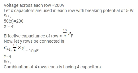It is required to construct a $10 \mu \mathrm{F}$ capacitor which can be connected across a $200 \mathrm{~V}$ battery. Capacitors of capacitance $10 \mu \mathrm{F}$ are available but they can withstand only $50 \mathrm{~V}$. Design a combination which can yield the desired result.
