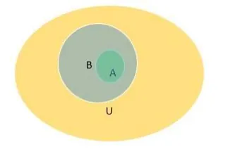 The overlapping region denotes $A \cap B$, and the orange region denotes the universal set U.