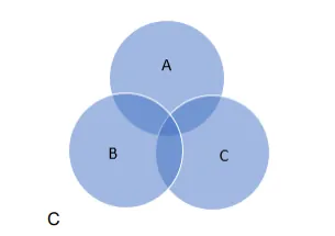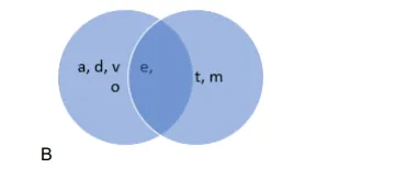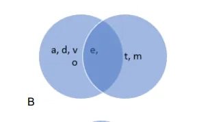 $A=\{a, e, I, o, u\}, B=\{a, d, e, o, v\}$ and $C=\{e, o, t, m\}$