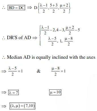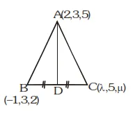 Let $\mathrm{ABC}$ be a triangle with vertices at points $\mathrm{A}(2,3,5), \mathrm{B}(-1,3,2)$ and $\mathrm{C}(\lambda, 5, \mu)$ in three dimensional space. If the median through $\mathrm{A}$ is equally inclined with the axes, then $(\lambda, \mu$.) is equal to: