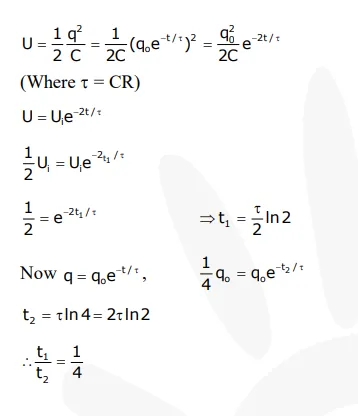 Let $\mathrm{C}$ be the capacitance of a capacitor discharging through a resistor $R$. Suppose $\mathrm{t}_{1}$ is the time taken for the energy stored in the capacitor to reduce to half its initial value and $t_{2}$ is the time taken for the charge to reduce to one-fourth its initial value. Then the ratio $t_{1} / t_{2}$ will be :