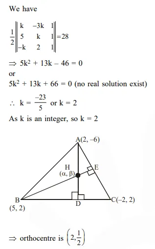 Question: Let k be an integer such that triangle with vertices (k, –3k), (5, k) and (–k, 2) has area 28 sq. units. Then the orthocentre of this triangle is at the point :