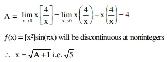 Let $[t]$ denote the greatest integer $\leq t$ and $\lim _{x \rightarrow 0} x\left[\frac{4}{x}\right]=A$. Then the function, $\mathrm{f}(\mathrm{x})=\left[\mathrm{x}^{2}\right] \sin (\pi \mathrm{x})$ is discontinuous, when $\mathrm{x}$ is equal to :