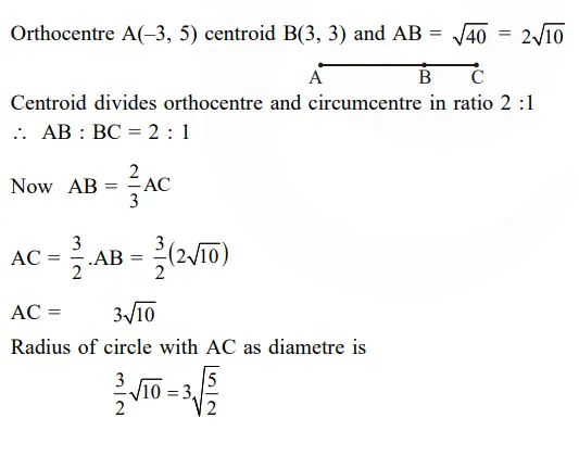 Let the orthocentre and centroid of a triangle be A(–3, 5) and B(3, 3) respectively. If C is the circumcentre of this triangle, then the radius of the circle having line segment AC as diameter, is: