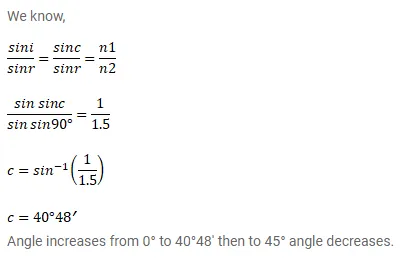 Light is incident from glass $(\mu=1.50)$ to air. Sketch the variation of the angle of deviation $\delta$ with the angle of incident i for $0<1$ $<90^{\circ}$.