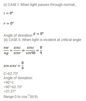 Light is incident from glass $(\mu=1.50)$ to water $(\mu=1.33)$ Find the range of the angle of deviation for which there are two angles of incidence.