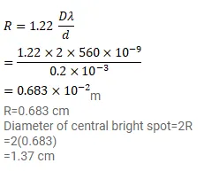 Light of wavelength $560 \mathrm{~nm}$ goes through a pinhole of diameter $0.20 \mathrm{~mm}$ and falls on a wall at a distance of $2.00 \mathrm{~m}$. What will be the radius of the central bright spot formed on the wall?