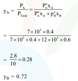 Liquids A and B form an ideal solution in the entire composition range. At $350 \mathrm{~K}$, the vapor pressures of pure A and pure $\mathrm{B}$ are $7 \times 10^{3} \mathrm{~Pa}$ and $12 \times 10^{3} \mathrm{~Pa}$, respectively. The composition of the vapor in equilibrium with a solution containing 40 mole percent of A at this temperature is:
