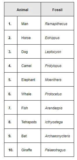 The modern day animals and their ancient fossils are listed in the following table.