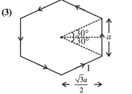 $\Rightarrow B=\frac{\mu_{0} I}{2 \sqrt{3} a}\left(\frac{1}{2}+\frac{1}{2}\right)=\frac{\mu_{0} I}{2 \sqrt{3} a \pi}$