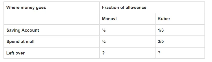 Manavi and Kuber each receives an equal allowance. The table shows the fraction of their allowance each deposits into his/her saving account and the fraction each spends at the mall. If allowance of each is ₹ 1260 find the amount left with each.