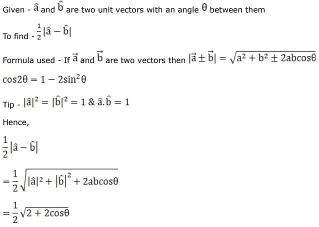If $\boldsymbol{\theta}$ is the angle between two unit vectors $\hat{\mathrm{a}}$ and $\hat{\mathrm{b}}$ then $\frac{1}{2}|\hat{\mathrm{a}}-\hat{\mathrm{b}}|=$ ?