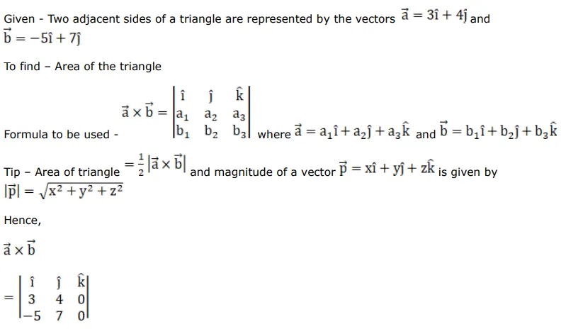 Two adjacent sides of a triangle are represented by the vectors $\overrightarrow{\mathrm{a}}=3 \hat{\mathrm{i}}+4 \hat{\mathrm{j}}$ and $\overrightarrow{\mathrm{b}}=-5 \hat{\mathrm{i}}+7 \hat{\mathrm{j}}$ The area of the triangle is