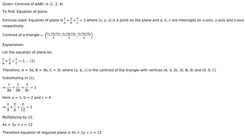 If a plane meets the coordinate axes in $A, B$ and $C$ such that the centroid of $\triangle A B C$ is $(1,2,4)$, then the equation of the plane is