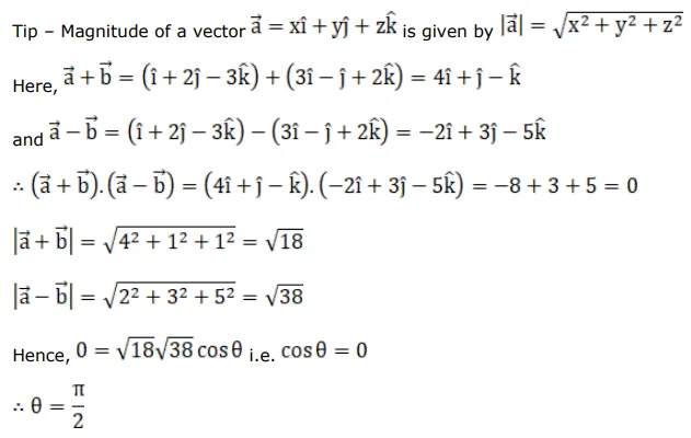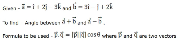 If $\overrightarrow{\mathrm{a}}=(\hat{\mathrm{i}}+2 \hat{\mathrm{j}}-3 \hat{\mathrm{k}})$ and $\overrightarrow{\mathrm{b}}=(3 \hat{\mathrm{i}}-\hat{\mathrm{j}}+2 \hat{\mathrm{k}})$ then the angle between $(\vec{a}+\vec{b})$ and $(\overrightarrow{\mathrm{a}}-\overrightarrow{\mathrm{b}})$ is