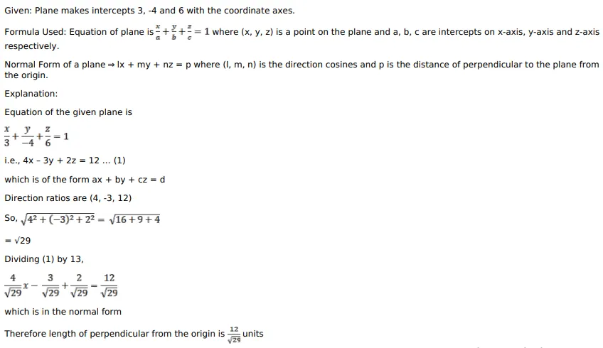 A plane cuts off intercepts $3,-4,6$ on the coordinate axes. The length of perpendicular from the origin to this plane is