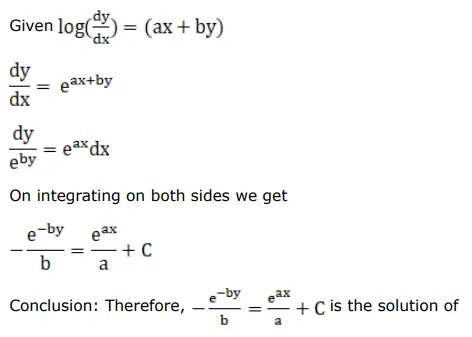 The general solution of the $D E \log \left(\frac{d y}{d x}\right)=(a x+b y)$ is