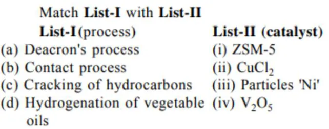 In manufacture of $\mathrm{H}_{2} \mathrm{SO}_{4}$ (contact process), $\mathrm{V}_{2} \mathrm{O}_{5}$ is used as a catalyst. $\mathrm{Ni}$ catalysts enables the hydrogenation of fats. $\mathrm{CuCl}_{2}$ is used as catalyst in Deacon's process. ZSM-5 used as catalyst in cracking of hydrocarbons.
