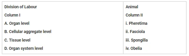 Match the following list of animals with their level of organisation.