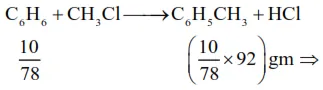 Methylation of $10 \mathrm{~g}$ of benzene gave $9.2 \mathrm{~g}$ of toluene. Calculate the percentage yield of toluene - (Nearest integer)